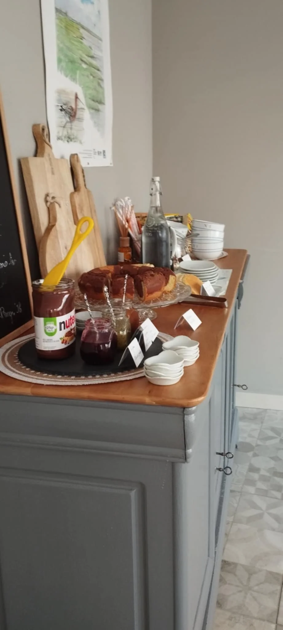 Bouilloire avec tisanes, machine à café avec dosettes à disposition.
