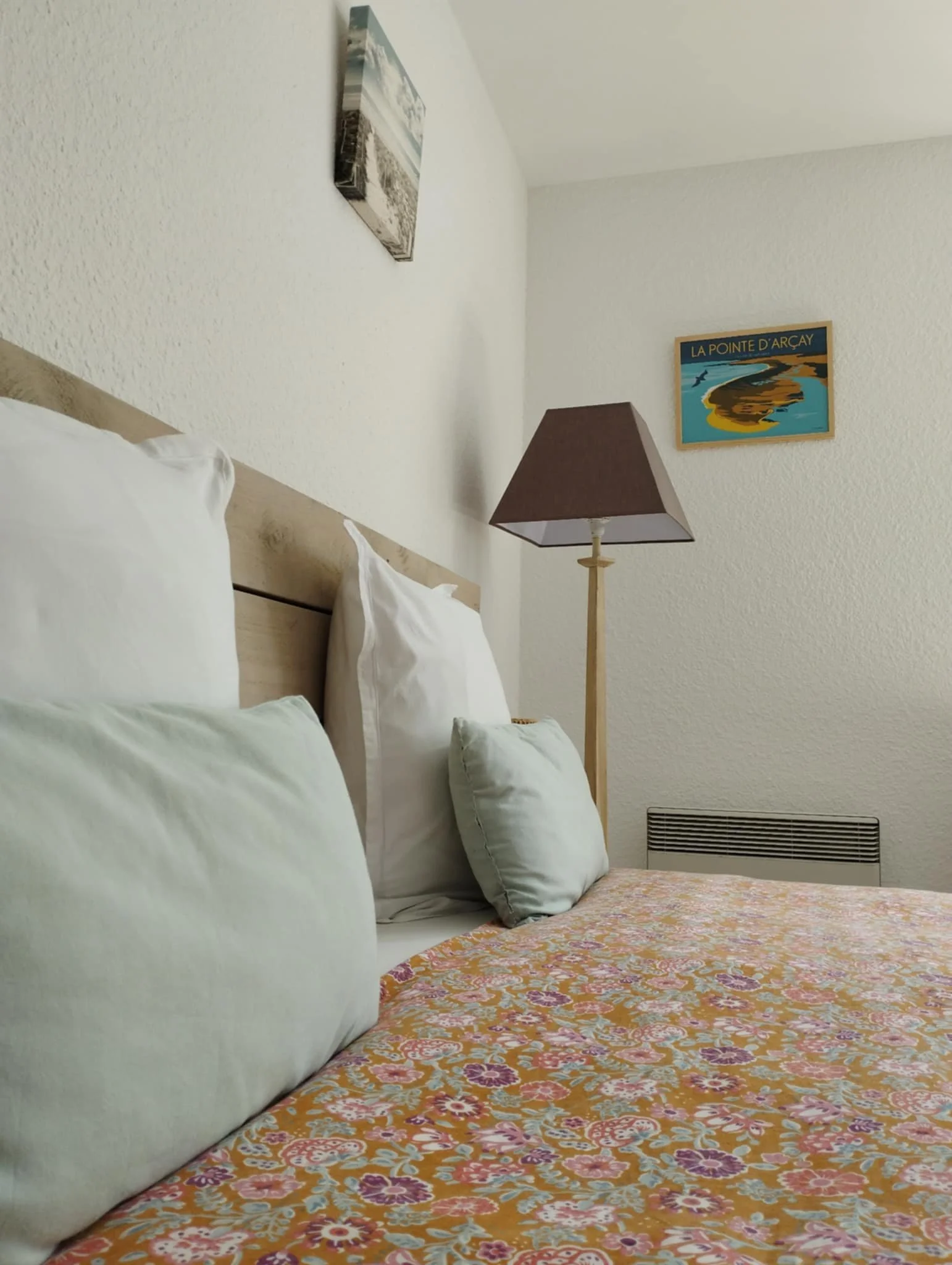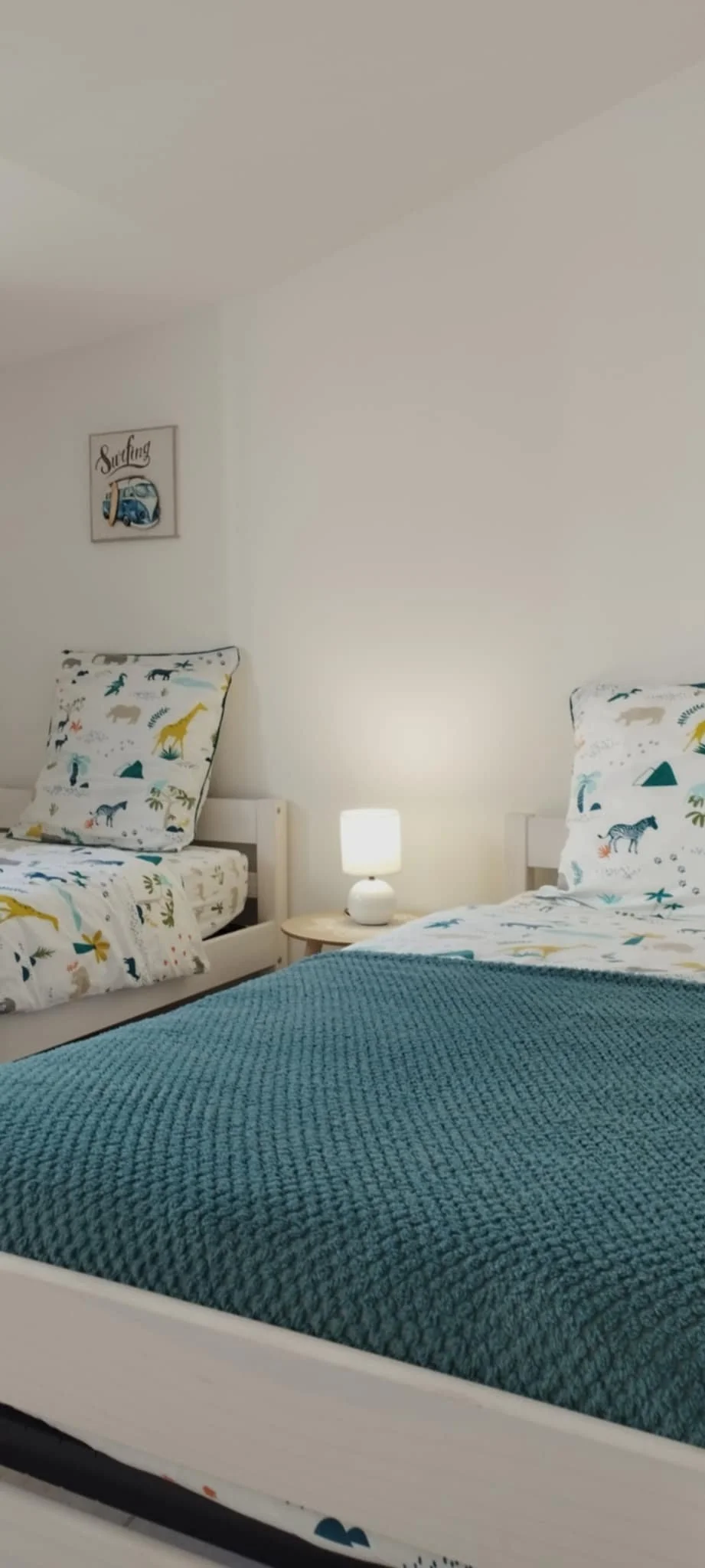La Chambre parentale donne sur une petite rue, la chambre enfant donne sur le patio avec le salon de jardin
